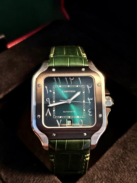 Cartier Santos, Steel on Leather, Green Arabic Dial